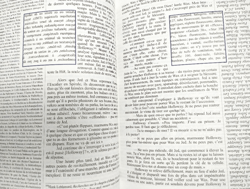 L’espace interstitiel d’une manière plus générale est source de mystère. Dans La Maison des Feuilles de Marc Z. Danielewski, les personnages sont confrontés à l’apparition d’espaces inconnus au sein de leur demeure. Des changements qui instaurent à la fois un malaise poussant la mère et ses enfants à partir, mais suscitent une telle fascination chez le père qu’il sera prêt à risquer sa vie pour découvrir l’étendue et la nature de ces espaces. L’auteur se joue des espaces que l’on croit connaître, de l’espace familier de la maison qui dans le récit prend la forme d’un labyrinthe, mais aussi de celui du livre, en déstabilisant le lecteur par une mise en page hors norme. (Fig. 6) Comme le souligne George Perec dans Espèce d’Espace, il n’y a normalement jamais chez soi de pièce ou d’espace qui soient indéfinis.