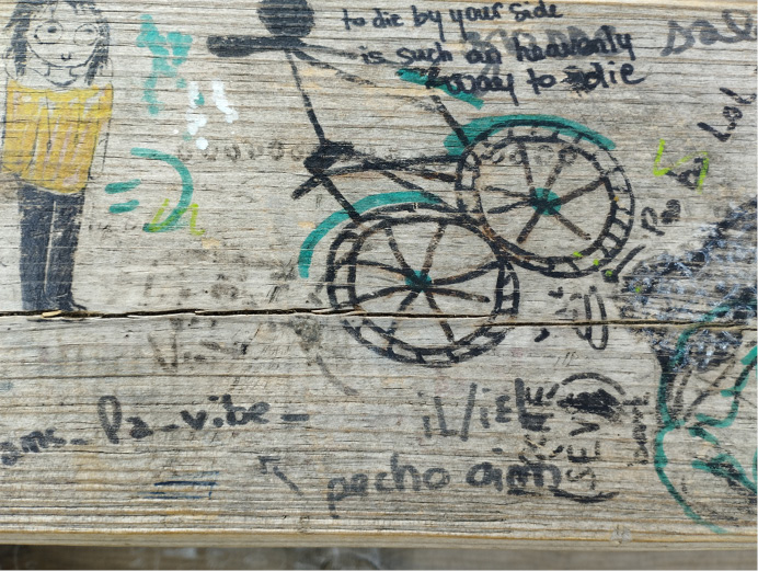 Dans mon observation des graffitis sur les tables de pique-nique de mon établissement, j’ai pu constater qu’il s’agissait d’un lieu où tout était dit. Dans le désordre fourni des dessins et des mots se cachent de multiples messages. Perdus au milieu des autres, leurs auteurs savent qu’ils peuvent être anonymes. Des mots d’amour, aux revendications et aux insultes, tout est dit. Sans filtre, humoristique ou provocateur, ces tables sont devenues des exutoires. Des supports d’expression sauvage, la ville en regorge. « Des hommes se sont cachés dans les monuments parisiens où ils ont gravé des messages. Dans les trifiums de Saint Bernard, on lit « Vive De Gaulle » « Vive Pétain » « Jean-Moulin Criminel ». »