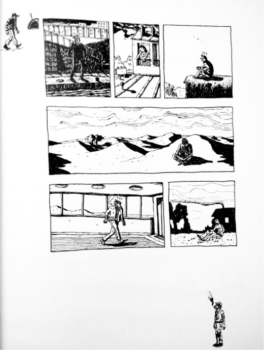 Dans La Casa de Victor Hussenot, les gouttières, l’espace blanc de la page et les marges ont plus d’importance que les cases. Ce lieu interstitiel du récit classique est investi comme un réel espace de narration portant celle-ci à plusieurs niveaux de lecture. Il y a l’histoire des cases, dans l’histoire de la page, installée dans l’histoire du livre tout entier. La page 15 (Fig. 8) est un bon exemple de cette mise en abîme. L’histoire dans les cases se confond avec celle de la gouttière.