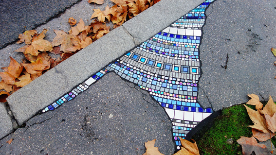 En rupture avec le tout qui le délimite, l’interstice est un manque, un intervalle dans la continuité. Parce qu’il dérange, il peut être envisagé de le combler pour l’intégrer au tout, pour unifier l’ensemble. Les projets d’urbanisme, de réaménagement et de reconversion réintègrent ainsi des espaces marginalisés comme les friches et les lieux abandonnés dans notre société. Tel est le travail des streets artistes EMEMEM (Fig. 9) et Jan Vorman (Fig. 10) qui, par de la mosaïque et des Lego, comblent les failles. Bien que leur travail artistique occupent le manque, le choix du médium avec lequel il le colmate (briques colorées) garde trace de la singularité de cet espace.