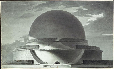 Une autre forme architecturale théorique apparait dans les dessins d’Étienne-Louis Boullée, par ailleurs proche de Claude Nicolas Ledoux3. Tout au long du XVIIIe siècle, Boulée théorise et représente des ensembles immaculés et lisses, des dessins presque dénués de couleur où l’architecture se retrouve centrée et imposante (figure 4, figure 5). Des formes précurseures du mouvement brutaliste dans l’architecture mais aussi d’une façon de penser les projets utopistes comme un concept gigantesque, transcendant les échelles habituelles. Enfin ces images annoncent aussi la forme graphique de ces projets. Des univers avec peu d’ornements où la simplicité règne.