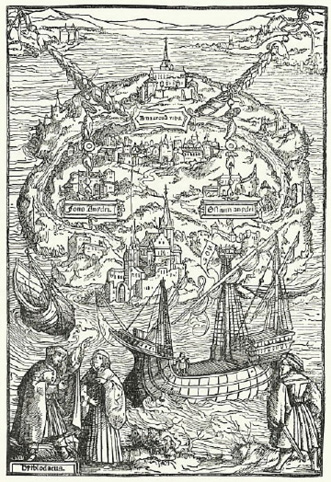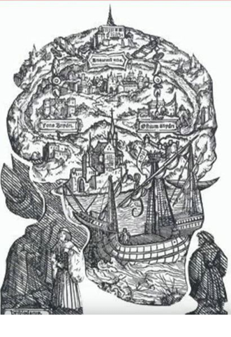 Bien qu’utopiste, le travail de More est ambigu. De nombreux symboles, choix de mots ou noms indiquent qu’il porte déjà sur son travail un regard critique (More veut dire le fou, Hythlodée, le menteur). Lorsque l’on prend du recul sur la carte de l’édition de 1518 (figure 9), les lignes se brouillent et des symboles se glissent dans l’image. Elle prend alors la forme d’un crâne (figure 10), présage de mort de la liberté, et auto-critique de la vanité qui s’empare de More dans l’ambition illusoire de créer un monde parfait.
