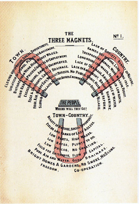 La pensée de Howard n’est pas seulement architecturale mais aussi politique (bien-être des ouvriers, système social de retraite). Elle nécessite alors des formes graphiques différentes se rapprochant plus de diagrammes (figure 8) pour vulgariser son fonctionnement à un grand public, que de projections architecturales.