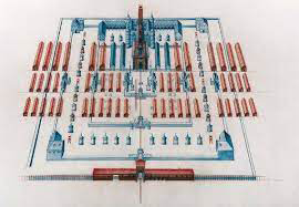 Pour illustrer ses propos, More utilise une carte, gravée une première fois par les frère Holbein en 1516 (figure 1), puis une seconde fois en 1518. Sur cette première carte, on y voit l’île agencée en cercle autour d’un point central. Cet agencement permet à la fois : de créer une égalité et un système équilibré, puisque les habitants sont à des distances équivalentes des points d’intérêts, comme dans le modèle des « cités jardins »1 ; et une hiérarchie puisque le centre est un lieu de pouvoir et permet de surveiller le reste de la population, comme dans le modèle des « salines royales »2 d’Arc-et-Senans (figure 3).