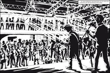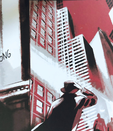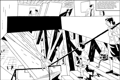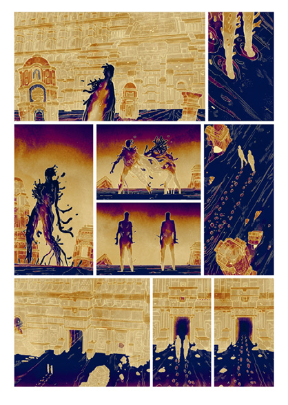 Ces visions abstraites de la ville sont aussi présentes dans « Carbone et Silicium » de Mathieu Bablet (figure 31). On y retrouve ici aussi, des corps dénaturés, flottant dans des espaces conceptuels où l’on retrouve encore quelques rares éléments figurant la ville (allées, murs). Elle n’y est que suggérée et les personnages s’y retrouvent comme dans un lieu parallèle au réel où des concepts impossibles physiquement prennent forme.