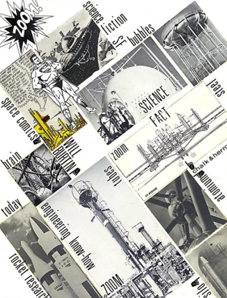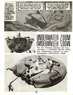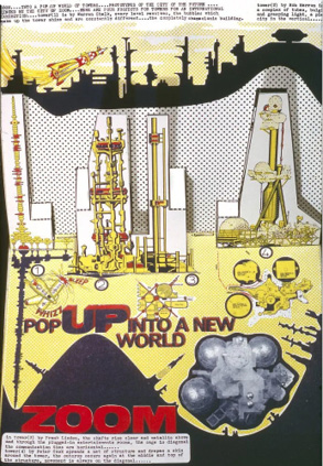 Zoom fait état de la pratique architecturale tout en en exposant les inspirations provenant des récits de science-fiction et notamment des comics. Profitant de cette occasion, ils réemploient des illustrations de comics pour construire leur numéro, mais aussi des bulles, onomatopées, etc. (figure 23, figure 25, figure 26)