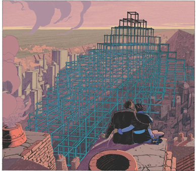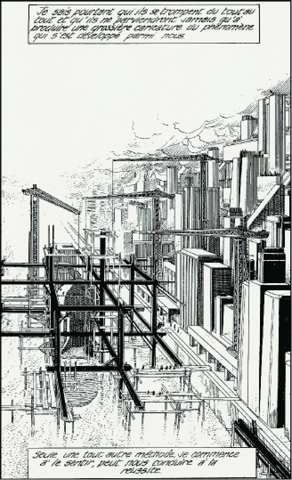 Enfin, au contraire d’Archigram qui emploie et présente des projets réels, certains illustrateurs proposent des fictions qui décortiquent ces utopies. Par exemple François Schuiten et Benoît Peeters s’emparent de cette image de « mégastructure ». On trouve dans l’ouvrage graphique « la fièvre d’Ubricande » ce principe ramené à son essentiel (figure 29).