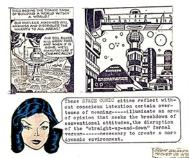 L’évolution de l’imaginaire architectural utopique entraine l’évolution des formes de diffusion et de la même façon que l’architecture s’inspire de la science-fiction pour produire des dessins nouveaux et changeants, le collectif Archigram (composé principalement de Peter Cook, Ron Herron, David Greene, Warren Chalk, Dennis Crompton, Mick Webb) va à son tour s’inspirer de la culture populaire pour faire passer ses idées.