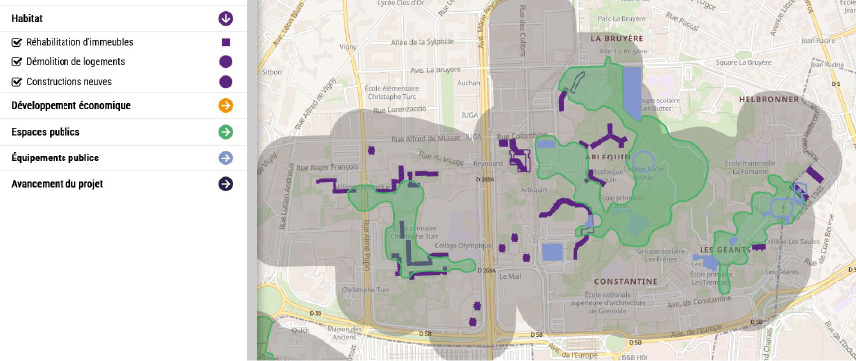 Par exemple, comme expliqué plus tôt, l’expérience de Villeneuve n’est pas une réussite sur le long terme puisqu’aujourd’hui, le quartier n’est plus capable de répondre aux attentes environnementales et sociales. Pour y remédier, la Villeneuve se rénove aujourd’hui en écoquartier solidaire (figure 34, figure 35) . Les habitants sont impliqués dans de petits projets, comme en 2018, où avec l’association AIDEC ils ont choisi les installations temporaires dans la crique de l’Arlequin (figure 36), mais aussi dans de plus gros projets avec l’organisation de groupes de travail entre les groupes référents (composés d’habitants mais aussi représentants des différents services du quartier) et les constructeurs.