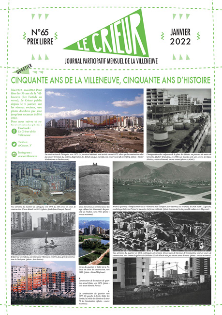 La rénovation du quartier qui passe par la destruction rencontre parfois une grande réticence du côté des habitants. Il faut alors imaginer comment mieux communiquer le projet à ceux-ci ou à minima de construire avec des changements plus acceptables pour la population vivant dans le quartier. Solution apportée par la gazette/journal (figure 37) « Le Crieur de la Villeneuve » depuis 2015. « Ce projet du Crieur de la Villeneuve est né pendant l’hiver 2013, après la diffusion du reportage d’Envoyé Spécial "Villeneuve, le rêve brisé". Nous nous sommes tout simplement dit qu’il était temps d’informer autrement sur la Villeneuve. »19. On y voit ainsi pour les habitants une façon de se réapproprier le quartier mais aussi de lutter contre l’imaginaire dystopique qui entoure la Villeneuve depuis l’échec de l’expérimentation utopique.