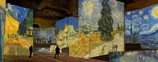 Bien que la technologie permette une approche plus contemporaine de l’art, elle l’a construit autant qu’elle l’a déconstruit. Lorsque l’approche du numérique n’est plus vouée à créer mais à dénaturer une œuvre classique, elle est discutable. En effet, plusieurs expositions immersives proposent une revisite des œuvres de divers artistes (Van Gogh, Mucha, ou encore Chagall entre autres) (Figure 3). Les sujets prennent vie, les toiles sont découpées, zoomées, superposées. Certes, cette démarche est attrayante et suscite de la curiosité ; mais elle disperse la concentration du spectateur en de multiples informations. Il ne peut alors prendre le temps d’observer le travail de l’artiste, les médiums choisis et les effets produits par ceux-ci. Les projections n’invitent pas le public à s’intéresser à ce qu’il y a au delà du résultat final. Oui, l’art devient abordable, mais il s’éloigne des musées. Dans la pensée collective, il peut être compliqué d’être sensible à ces pratiques lorsque nous ne sommes pas initiés. Pour autant, les expositions immersives sont à double tranchants et ne sensibilisent pas forcément de la meilleure des manières.
