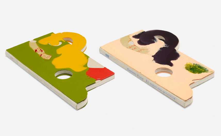 Gaetano Pesce, né le 8 novembre 1939 à La Spezia, en Ligurie, et décédé le 3 avril 2024 à New York, était un architecte, peintre, designer, sculpteur et philosophe italien de renom. Le design radical des années 1970, dont il fait partie, prône l’anticonformisme et la réinvention, sans manifeste clair. Il s’oppose aux codes traditionnels et explore de nouvelles associations de couleurs et de matières pour redéfinir la notion de beauté. Le livre Le temps des questions14 (Figure 5) publié en tant que catalogue de l’exposition de Paris, se présente comme un livre d’artiste. Composé de 144 pages reliées en dos toilé, il est doté d’une couverture en résine polychrome ajourée, conçue par Gaetano Pesce, dont la couleur varie d’un exemplaire à l’autre. Cette série différenciée se manifeste par le choix de couleurs variées pour les couvertures, mais aussi par l’utilisation d’un matériau liquide, dont le comportement et la forme sont difficilement prévisibles. Les irrégularités visibles sur certains bords, résultant du flux de résine, illustrent cette recherche de diversité et d’imprévisibilité. Ces irrégularités sont des caractéristiques que le designer valorise, rendant chaque livre unique. Cette singularité contribue à leur rareté, une qualité qui a progressivement accru leur valeur aux yeux des collectionneurs. Gaetano Pesce introduit des éléments différenciants tels que les défauts de fabrication, le hasard et l’intervention humaine, qui redonnent une place essentielle à l’artisanat à une époque marquée par l’industrialisation. Ce livre-objet, conçu comme un livre d’artiste, mesure 21,4 x 32,8 cm et comprend 186 illustrations. Initialement vendu à 420 F (environ 64 €), il est aujourd’hui revendu à des prix bien plus élevés, atteignant 645 € sur Etsy et 1178 € sur Amazon. Ce sont donc désormais des objets collectors rares. La raison de leur convoitise est double : peu d’exemplaires et série différenciée15.