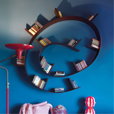 D’autre part, la célèbre étagère Bookworm de Ron Arad évoque un jeu subtil entre son nom et sa forme (Figure 12). Le terme « bookworm » désigne à la fois une personne passionnée de lecture et les parasites des livres, évoqués ici par la spirale de l’étagère, rappelant la forme d’un ver. Cette étagère, bien qu’esthétique, offre un espace limité pour les livres, obligeant son propriétaire à faire une sélection. Cette contrainte transforme les livres choisis en objets de curiosité. L’apparence atypique de l’étagère attirera peut-être l’attention de ses invités, qui, intrigués, s’intéresseront également aux ouvrages. C’est une manière originale et décalée de mettre en valeur ses livres et de les exposer.