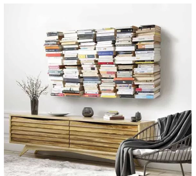 Au-delà de la bibliothèque classique, il existe de nouvelles propositions de rangement des livres, plus contemporaines, où les livres sont intégrés au décor de la maison plutôt que rangés dans un meuble distinct, dans une pièce dédiée. Cela crée une proximité sentimentale entre le livre et son propriétaire. Par exemple, dans la section Maison d’une presse généraliste19, on propose d’adopter le concept du « coffee table book », un livre placé sur une table uniquement à des fins décoratives. Ici, c’est donc l’apparence de sa couverture qui importe. Cette disposition suggère que l’on expose un livre que l’on trouve beau ou que l’on apprécie particulièrement, tout en permettant de le feuilleter aisément. Sur ce même blog, on trouve également une suggestion originale où les livres sont disposés horizontalement, avec la tranche visible, formant un rectangle qui semble flotter sur le mur (Figure 11). Les livres sont triés par formats puisqu’ils s’équivalent tous afin de garder un équilibre. De cette manière, une sorte de tableau composé de tranches de livres se crée, transformant cet assemblage en un élément décoratif puisqu’il n’est plus fonctionnel. Cela montre que la matérialité du livre joue un rôle clé dans sa perception, le rendant capable de transcender sa fonction de support de lecture pour devenir une œuvre d’art à part entière lorsqu’il est intégré dans un ensemble. Une autre façon de ranger les livres en privilégiant l’esthétique est de les classer par couleur. Cette méthode est controversée car même si visuellement attrayante, elle conduit à disperser les volumes d’une même série à différents endroits.