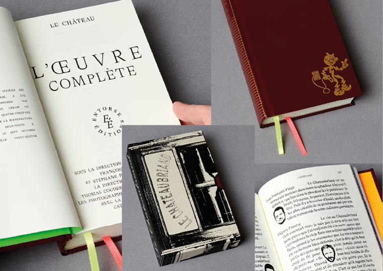 L’ouvrage Le Château24, s’inspire de l’ostentation et des codes des livres du XXe siècle tout en les réinterprétant avec une touche contemporaine. Ce livre (Figure 14), consacré à l’histoire du restaurant Le Chateaubriand, repose sur une série d’entretiens avec cent personnes. Sa conception graphique a été réalisée par Helmo, avec des photographies de Benjamin Malapris, et son impression a été confiée aux ateliers Les Deux-Ponts, en un tirage limité de 2000 exemplaires. Au format de 12 × 19 cm, l’ouvrage compte 440 pages et adopte des caractéristiques proches d’un livre de littérature classique de luxe : couverture en cuir, papier écru, impression noir sur blanc, et dorure à chaud. Toutefois, certains détails lui confèrent une esthétique plus contemporaine. La tranche rouge foncé évoque les livres classiques, mais la première de couverture abandonne les cadres vernaculaires à la grotesque typiques au profit d’un personnage rétro. Le traitement graphique de ce personnage, son positionnement, ses proportions et son style de trait, lui donne un aspect contemprorain. Les rubans signets, habituellement associés aux éditions de luxe, sont présents, mais dans des couleurs fluorescentes, ce qui ancre l’objet dans une temporalité actuelle. Les pages de garde collées suivent la même logique, jouant sur un contraste entre tradition et modernité. La jaquette, elle, se distingue par sa forme de coffret, inhabituelle dans ce contexte. Elle arbore un visuel photographique dont le traitement d’image évoque l’usure, ajoutant une dimension nostalgique mais subversive. À l’intérieur, la mise en page respecte certains codes classiques : les titres de chapitres et la pagination apparaissent en haut de page, un choix typique des romans mais moins fréquent pour un ouvrage documentaire. Cependant, des éléments graphiques disruptifs viennent bousculer ces conventions, comme les visages des personnes interviewées intégrés aux blocs de texte, créant des habillages originaux et des décalages visuels. Ainsi, Le Château joue habilement avec les codes du design éditorial traditionnel, tout en les transformant pour offrir une expérience graphique et narrative unique qui honore les livres oubliés dans les bibliothèques de nos grand-parents.