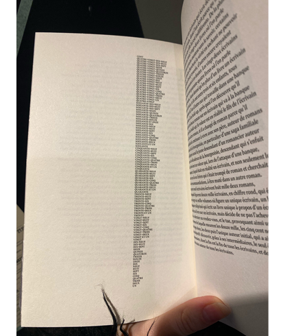 Olivier Gadet est un éditeur qui aime publier de beaux textes littéraires dans des livres contemporains. En outre, il m’a confirmé qu’il avait un goût pour déjouer les règles. Selon lui, les conventions sont là pour à être contournées. J’ai analysé les couvertures et les mises en page des éditions appartenant aux collections Rouge-Gorge et Cosaques32. Pour Cosaques, le titre du livre se situe sur la quatrième de couverture (Figure 21) (choix inhabituel et peu conventionnel dans l’édition), tandis que la première contient un visuel (Figure 20). Pour Rouge-Gorge, l’originalité réside dans un paragraphe supplémentaire placé en bas de la couverture, en typographie plus fine (Figure 22). Ce texte, bien qu’invisible de loin, se lit aisément de près, incitant le lecteur à interagir avec le livre. La mise en page varie d’une édition à l’autre et même d’un passage à l’autre : dans les deux collections, on retrouve parfois du texte en mode paysage ou des typographies de grande taille mêlées à des caractères plus petits. D’autres pages présentent des blocs de texte avec des marges irrégulières, souvent décentrés, offrant une expérience de lecture unique. Cette approche diffère des éditions littéraires classiques, où l’interlignage, la taille des caractères et le sens de lecture sont standardisés. Selon l’édition, la numérotation des pages est présente ou non, mais si elle l’est, elle n’est jamais anodine et fait partie du jeu du graphiste. Par exemple, dans Centurie33, la numérotation est écrite en toutes lettres sur la page de gauche, et le nombre de la page actuelle s’ajoute à celui de la page précédente (Figure 23). Ici, le graphiste rythme la lecture en variant la mise en page, invitant le lecteur à rester attentif et engagé. Des illustrations ou images en bichromie interrompent parfois les pages de texte. Le designer joue donc davantage sur le texte, le rythme, les images et les détails d’impression que sur l’usage de la couleur, qui reste discrète.