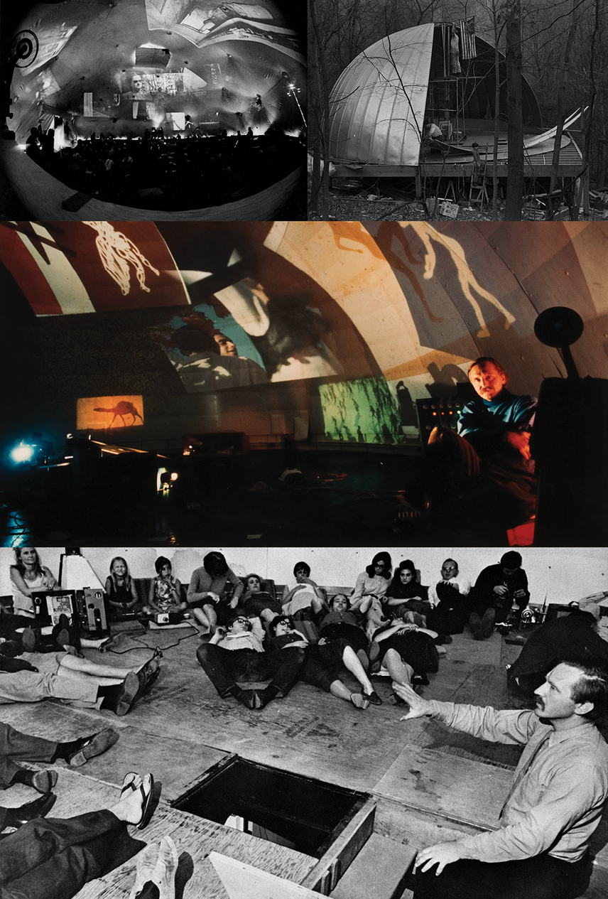 Parmi les pionniers de ce mouvement, Stan Vanderbeek se distingue avec la création du Movie Drome (voir figure 1) en 1964-1965, un dispositif alors inédit pour l’époque. Son principe ? Un espace immersif et clos, conçu à partir de la structure supérieure d’un silo à grains. À l’intérieur, les spectateurs, allongés, contemplent des projections sur une surface hémisphérique en aluminium. Les contenus diffusés sont très divers : actualités, films d’animation, collages réalisés par Vanderbeek, dessins, diapositives issues de l’histoire de l’art ou de l’anthropologie, mais aussi des références à la publicité et à la culture populaire. Ce foisonnement visuel, où les images se superposent s’accompagnent de sons quadriphoniques et de jeux de lumière, produisant un effet de surcharge sensorielle. Pour ceux qui en font l’expérience, il s’agit d’une véritable immersion sensible.
