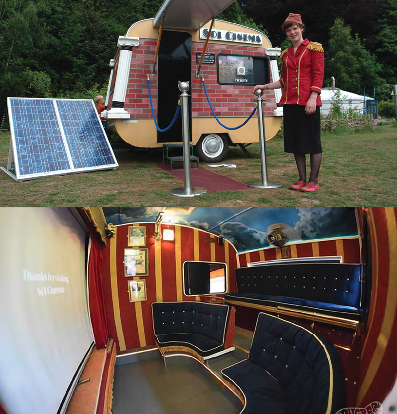Certaines initiatives ne sont pas tournées vers l’innovation technologique et s’ancrent dans d’autres valeurs. L’un des autres axes fréquemment explorés est la médiation cinématographique, avec une attention particulière portée à l’accessibilité et à la diffusion itinérante. C’est dans cette perspective que s’inscrit le Sol Cinema (voir figure 2), un espace de projection nomade à l’approche humaine et durable souvent présenté comme « le plus petit cinéma du monde ». Construit en 2009 au Royaume-Uni par Jo Furlong, avec l’aide d’artistes tels qu’Ami et Beth Marsden ainsi que du réalisateur Paul O’Connor, ce projet réemploie une ancienne caravane, transformée grâce à des matériaux recyclés et alimentée exclusivement par l’énergie solaire. L’intérieur offre une expérience intime : huit sièges, un écran, un projecteur et un système sonore surround. La décoration mêle rayures rouges et dorées sur les murs et plafond peint, et dépasse la simple fonctionnalité pour créer une atmosphère immersive. À l’extérieur, l’habillage est fait de colonnes, d’un motif de briques et de l’inscription « Sol Cinema ». Lorsqu’il est implanté, un tapis est déroulé avec des barrières cordons. On ne cherche pas seulement la fonctionnalité, mais à rendre ce dispositif original et identifiable. Le Sol Cinema diffuse des œuvres rares ou amateurs, accessibles gratuitement grâce à un billet symbolique. Paul O’Connor, convaincu du pouvoir transformateur du média vidéo, voit dans le Sol Cinema un vecteur de changement social : en se déplaçant de lieu en lieu, il favorise l’accès, provoque des échanges et fait découvrir des créations souvent méconnues. Les métrages sont montrés en festival de musique, de cinéma, d’artistes, en ville, dans des écoles. L’initiative se place comme médiateur de la culture et d’éducation. Parfois, les réalisateur.ices interviennent, affirmant la dimension de dialogue. En intervenant aussi bien en intérieur qu’en extérieur, la caravane a traversé tout le pays, et même atteint les Balkans. Grâce à sa mobilité, elle permet de projeter des films dans des lieux inattendus « we can go in the middle of a forest and show screenings »17, rendant ainsi le cinéma accessible à tous, partout.