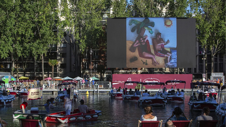 À l’occasion de l’ouverture de Paris Plage 2020, la mairie de Paris, en collaboration avec MK2, ouvre « Boat-in », un cinéma sur l’eau dans le respect des règles sanitaires et environnementales (voir figure 3). Pour l’occasion, une flotte de 38 bateaux électriques pouvant accueillir entre 2, 4 et 6 personnes (d’une même famille ou groupe d’amis) était mise à disposition pour la projection du film de Gilles Lellouche Le Grand Bain, diffusé sur un écran LED de 16x9m. Par ailleurs, 150 transats avec casques audio étaient disponibles pour assister gratuitement à cette séance depuis les berges.
