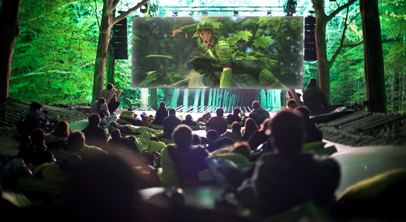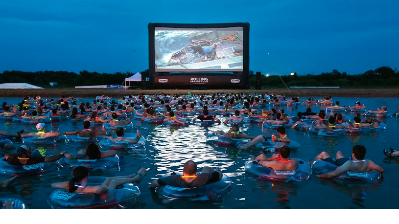 La piscine Pontoise à Paris propose de temps à autre des séances « Aqua-ciné » où les spectateurs sont dans des bouées, des sièges flottants et peuvent utiliser des frites. Dans ce même cinéma les spectateurs dans des barques pouvaient assister à l’avant première du film « L’Odyssée de Pi ». En 2013, le film « Epic – La Bataille du Royaume Secret » était diffusé perché dans les arbres pour vivre les sensations du film au maximum, grâce à une toile tendue et des coussins (voir figure 5). En 2018, Alamo Drafthouse organisait une séance du film « Les Dents de la Mer », dans des bouées sur la surface d’un lac texan, de quoi se mettre dans les conditions du film, se passant principalement dans l’eau (voir figure 6).