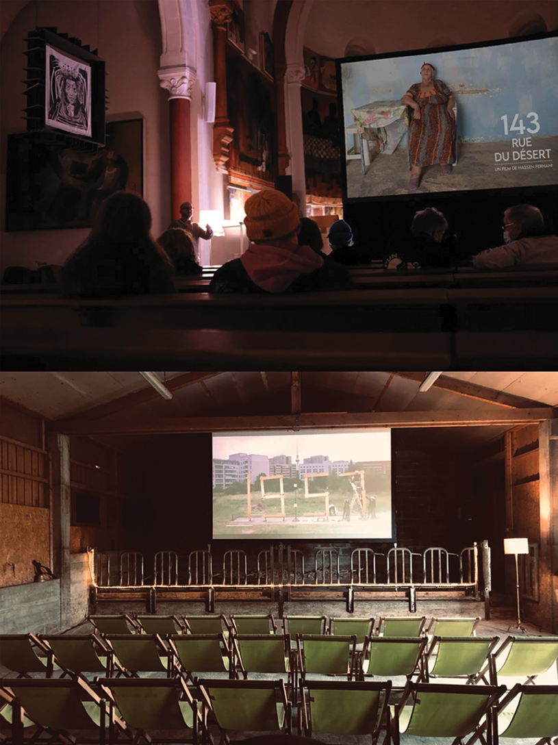 Le principe des événements organisés par À Bientôt J’espère repose sur des projections-discussions, dans des lieux du quotidien réinventés temporairement : maisons de quartier, bars, campings, hôtels, caravanes, ou structures sociales. Plus insolite, ils explorent même des lieux plus éloignés d’activités humaines classiques, comme le musée Arcabas à Saint-Pierre-de-Chartreuse ou une étable à Presles, dans le Sud Grésivaudan (voir figure 7). Ici, le cinéma s’affranchit des espaces urbains densément peuplés ou des infrastructures traditionnelles, pour s’implanter dans des endroits plus reculés, isolés. Ces zones ne bénéficient pas forcément d’infrastructures culturelles, de fait, subissent des inégalités. Ici, c’est le cinéma qui se déplace vers son public.