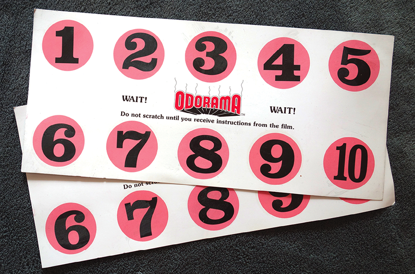 En 1981, le film Polyester de John Waters introduit l’Odorama un procédé qui invite le spectateur à une expérience sensorielle en parallèle de la projection du film avec des stimuli olfactifs. Chaque spectateur recevait une carte à gratter numérotée avec dix zones correspondant à des moments spécifiques du film (voir figure 10).Lorsque le numéro apparaissait à l’écran, le spectateur grattait la zone correspondante pour sentir une odeur. Ce dispositif, franchement modeste, s’inscrivait avec brio dans l’humour outrancier et provocateur de John Waters. Ce gag sensoriel était une extension du film et permettait de provoquer des réactions, on se limite plus à l’audio et à l’image, un nouveau sens est engagé. L’Odorama crée une interaction entre le spectateur et le film, il exploite le sens olfactif pour provoquer, choquer ou faire rire.