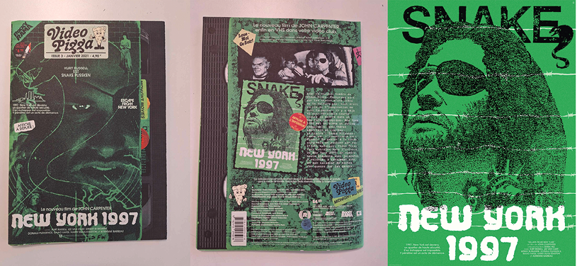 Les posterbooks Video Pizza par Rockypapers (voir figure 12), réactivent un imaginaire émotionnel et générationnel lié à des époques charnières de la culture populaire, comme les vidéoclubs et les soirées VHS (années 80 et 90). Video Pizza est un objet hybride, à mi chemin entre le magazine et l’esthétique d’une VHS. Sa lecture est sensorielle, renvoie à des codes familiers : sticker du prix, texture vieillie simulant une VHS usée, slogans accrocheurs (« loue moi ce soir ! » ; « affiche à l’intérieur »), logos multiples. Tous ces éléments sont des rappels directs à des gestes et des habitudes familières pour certaines générations. L’ensemble du traitement graphique, volontairement expressif et expérimental tend à évoquer un travail manuel, inscrit dans l’esprit Do It Yourself, rappelant la pratique du fanzine (en France, Darkness et Ciné Zine Zone par exemple), un média largement utilisé dans les sphères des passionnés de cinéma bis dans les années 70 et 80, à une époque où le numérique ne s’était pas encore imposé. On ne recherche pas la fonctionnalité, plutôt une forme d’affect. Ces choix maximalistes s’accordent avec l’esprit audacieux du cinéma bis et renforcent la cohérence d’une identité propre, qui se distingue d’un cinéma plus traditionnel. Jean Granon, à l’origine de ce travail, ne vise pas uniquement des spectateurs nostalgiques, il propose aux nouvelles générations une synthèse immersive d’une époque donnée par la réactualisation des codes visuels du passé avec des outils de création modernes. Il valorise des styles oubliés, et ancre le projet dans des références historiques crédibles. Ce travail, bien qu’étant une parodie/hommage second degré de supports emblématiques, vise une forme d’authenticité dans ses choix graphiques et sa volonté de réveiller des souvenirs, de cultiver un lien affectif avec le cinéma.