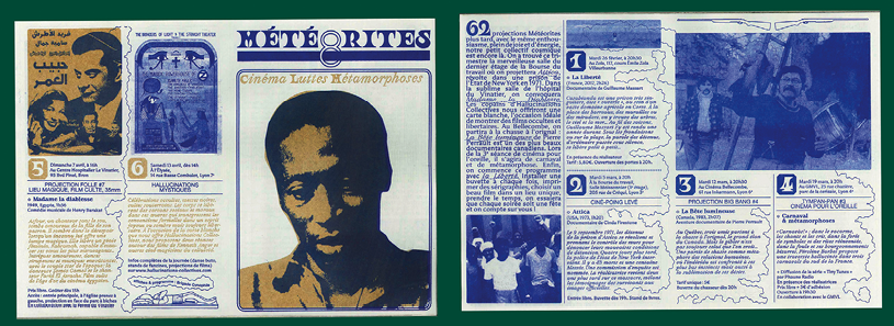 Félicité Landrivon a pendant longtemps collaboré avec le collectif Météorites, une association lyonnaise dédiée à la diffusion de films documentaires et expérimentaux méconnus dans des lieux atypiques (églises, souterrains, piscines, etc) qui allait au-delà de la diffusion d’un film. Ils proposaient à l’instar de À Bientôt J’espère, des discussions, des repas, des ateliers avec comme dessein le rapprochement social. Pour le programme Hiver/Printemps 2019, par exemple, Landrivon mixe dans sa conception graphique accessibilité (la lisibilité et l’immédiateté de l’information entre autres) et esprit underground (illustrations, non respect de certaines règles de design graphique, imperfection volontaire par les décalages de couches de couleurs) (voir figure 13).
