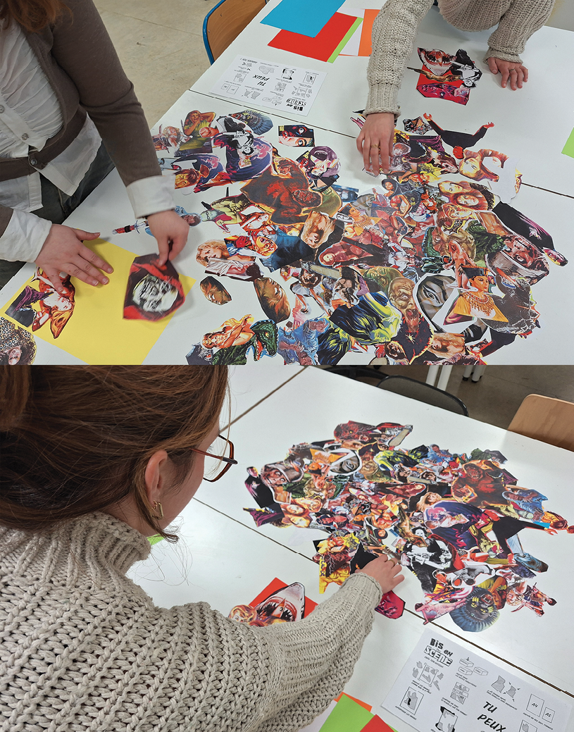 Une fois les éléments sélectionnés, imprimés et découpés, j’ai invité chaque personne qui voulait se prêter à ce jeu à utiliser ces fragments pour concevoir sa propre affiche de cinéma bis, le tout sur un format A4 ou A5. Le but ? Recréer de nouvelles affiches à partir de fragments d’autres, mélanger les genres, les personnages, les styles d’illustration pour un rendu décalé et absurde. Cette approche reflète l’esprit du cinéma bis, qui est non dogmatique et n’a pas peur des hybridations. Le résultat final ? Des créations surprenantes, saugrenues, aux titres de films extravagants qui donnent envie de les voir prendre vie à l’écran (voir figure 14).