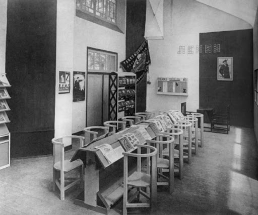 En effet, la situation française, bien que plutôt agitée d’un point de vue militant, met du temps à évoluer. Les fondements idéologiques arrivent des pays de l’Est de l’Europe, et se développent particulièrement dans la première moitié du XXe siècle, notamment avec le régime communiste de Lénine9 en URSS. Dans l’idée, le système se veut institué par et pour la classe populaire, la masse ouvrière représentant une part très importante de la population dans les pays portés vers l’industrie. Il s’agirait de donner le pouvoir au peuple, en l’éduquant, ce qui lui permettrai de lui-même se gérer, et peser dans les institutions étatiques. Le Club ouvrier d’Alexandre Rodtchenko10 (fig. 2), artiste et designer soviétique, illustre bien les idéaux de cette période. Cette proposition d’organisation de l’espace est mise en place dans le cadre de l’Exposition Universelle de Paris de 1925. Il s’agit d’une pièce intégralement agencée d’un mobilier adaptable à de nombreux environnements. L’objectif est de donner au travailleur un lieu propice à l’auto-éducation, à l’accès à la culture, créant une coupure avec son temps de travail. Cet espace dédié aux ouvriers, vise à permettre dans des conditions optimales, la lecture, l’information, la discussion collégiale ou encore le divertissement intellectuel tel que le jeu d’échecs. Inscrit dans le cadre du constructivisme, le mobilier épouse des formes simples, géométriques, compatibles avec une production de masse : il doit être pratique et accessible à tous. L’ouvrier est là au cœur des préoccupations, et son émancipation culturelle est vue comme la pierre angulaire de son bien-être. L’aliénation par le travail, la pénibilité et la déshumanisation sont alors des faits bien intégrés, que Rodtchenko cherche à contrer.