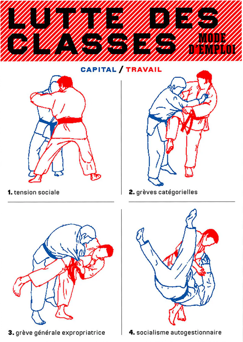 Cette influence se remarque encore aujourd’hui dans le travail de Sébastien Marchal par exemple. Il est possible de retrouver son travail, accompagné de Marie Maroilleau, dans l’initiative Formes de lutte lancée en 2024 en union contre la droitisation du pouvoir. Son affiche Lutte des classes, mode d’emploi (fig. 5), de 2019, s’inscrit également dans cette volonté de graphisme populaire. Il met des visuels, dont celui-ci, à disposition du grand public, pour qu’il se l’approprie. Le propos se veut synthétisé et didactique, simple à appréhender : la lutte des classes par la grève généralisée se veut à portée de main, la porte de sortie (utopique) à toute forme d’organisation régie par le « capital ».