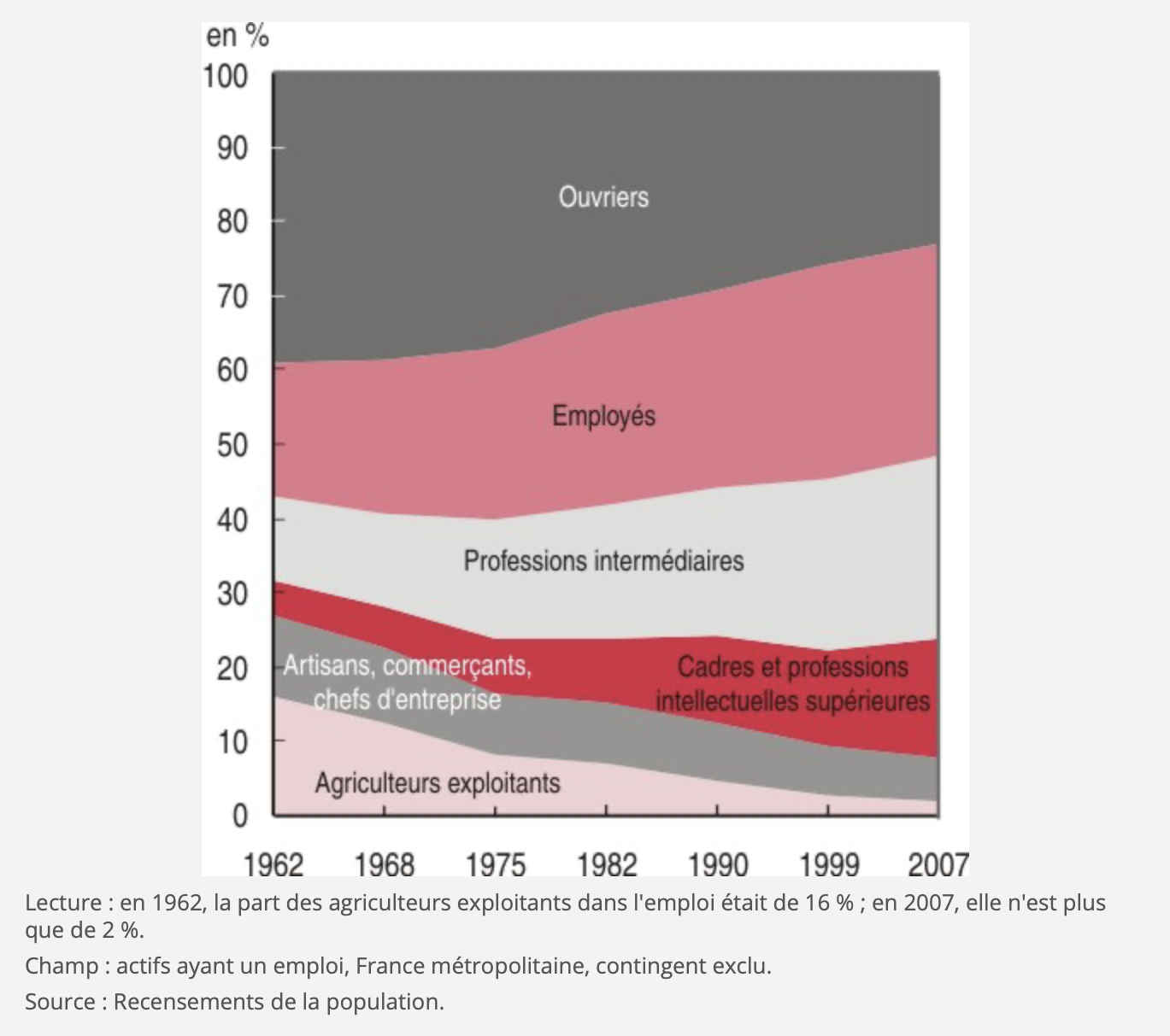La place de l’ouvrier, en France, a donc profondément évolué depuis l’industrialisation. Au début du XXe siècle, il représentait une part majoritaire de la population active (fig. 6), or, leur proportion a considérablement diminué, essentiellement à cause de la tertiairisation de l’économie, ainsi que la délocalisation des usines dans des pays aux coûts de production moindres. Selon l’Insee, les ouvriers représentent environ 25 % de la population active en 2006, contre seulement 19 % en 2021, illustrant un déclin de cette population.