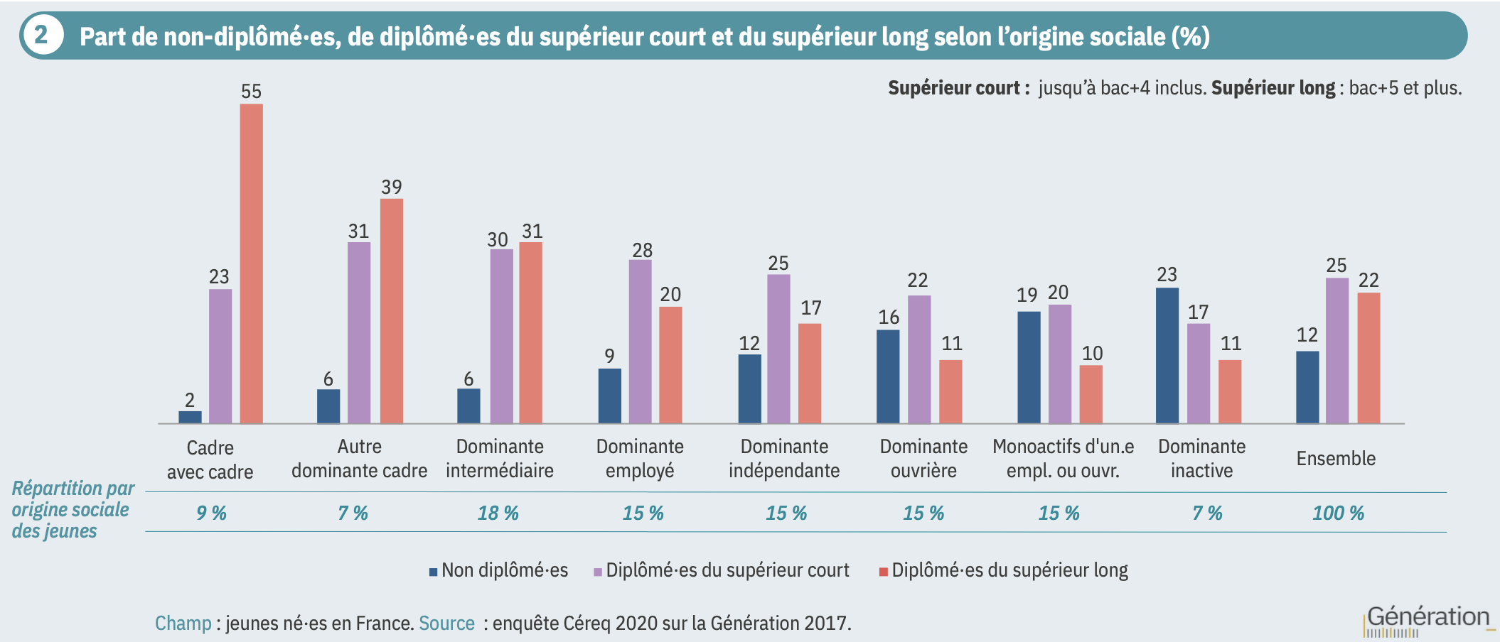 La reproduction sociale est une notion développée par Pierre Bourdieu et Jean-Claude Passeron au courant des années 1960, ils publient notamment La Reproduction24 en 1970. Cette notion est essentielle afin de comprendre pourquoi, malgré des politiques publiques d’égalisation des chances, les inégalités sociales persistent. En effet, selon une étude du Céreq publiée en mai 2024, Origine sociale, diplôme et insertion : la force des liens25, les enfants diplômés de bac+5 dont les deux parents sont cadres sont 78 % à être cadres eux-même, contre seulement 60 % des enfants issus de familles à dominante ouvrière (fig. 10). L’étude montre également qu’en affinant les critères avec les domaines de formation et la nature précise du diplôme, une personne issue d’une famille ouvrière a toujours environ deux fois moins de chances de devenir cadre, à diplôme égal, qu’une personne dont les parents le sont ou l’ont été.