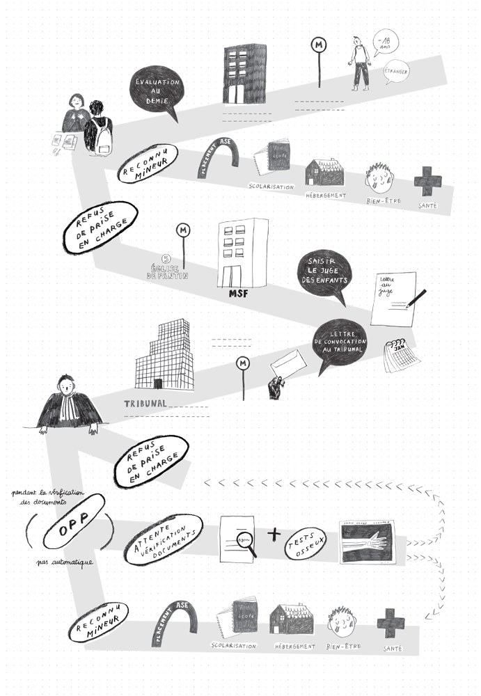 Cependant, le design peut également devenir une voie pour conscientiser et rendre plus tangibles les mécanismes qui régissent notre société. L’objectif n’est pas seulement d’informer de ces enjeux de justice sociale, mais de rendre compte de l’inscription de l’usager dans ce mécanisme. Pauline Ayoudj par exemple, en concevant en 2020 l’outil de médiation Parcours37 (fig. 12), aide des jeunes exilés en France à obtenir le statut de mineur accompagné. Cet outil de médiation prend la forme de papiers administratifs simplifiés, essentiellement graphiques, faciles à comprendre pour un jeune public ne maîtrisant pas forcément la langue. Tout d’abord, la facilitation graphique n’est pas qu’au service du jeune usager, mais est aussi utile à l’agent administratif. En effet, le support est envisagé comme évolutif : des étapes peuvent être cochées, entourées pour être mises en avant, des espaces sont laissés pour annoter des précisions. Il sert donc également à fluidifier la communication. Ensuite, cet outil sert surtout à comprendre le cadre légal dans lequel ces jeunes s’inscrivent, et le niveau auquel ils se trouvent dans cette machination administrative. L’objectif n’est pas simplement de les guider, mais de leur donner les outils permettant une indépendance de mouvement, au sein de ce parcours légal, et une compréhension de leur situation. Ce travail peut être mis en relation avec la mobilité social car il traite également de la compréhension de la place de l’individu au sein de rouages complexes.